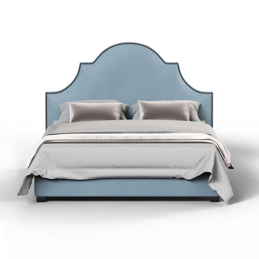 The Elara Upholstered Bed features a soft blue fabric headboard finished with elegant nailhead trim. Designed for comfort and style, it adds a calm, refined touch to any modern bedroom.