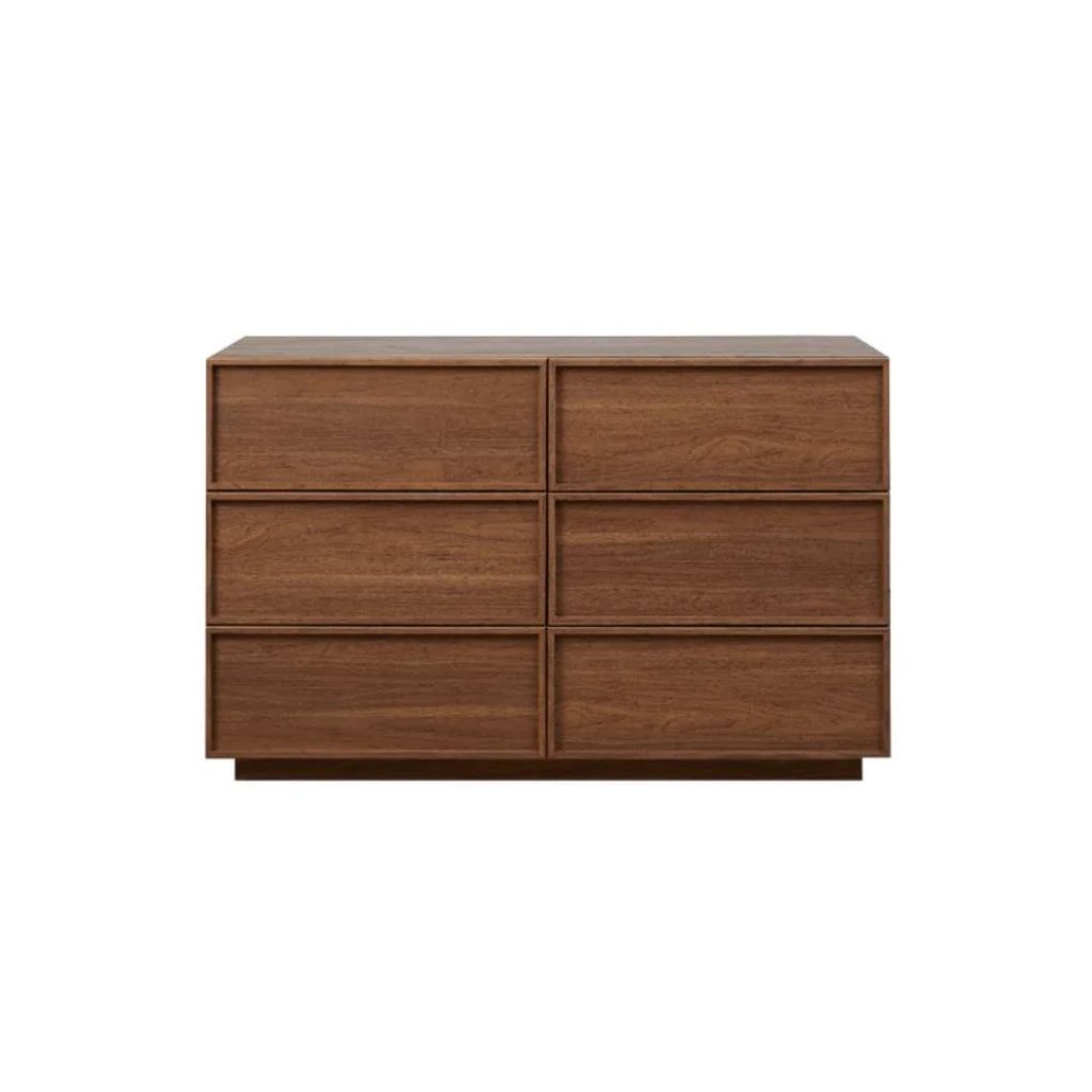 The Oslo Minimalist Walnut Wood Dresser blends beautifully with CloudRest Low Platform Bed completes the bedroom with a clean, modern touch.