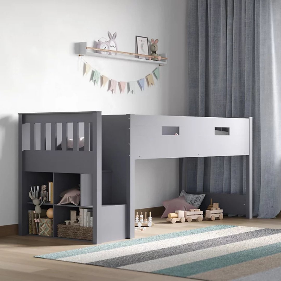 Organize toys, books, or clothes with the open cubby shelves under the bed. -