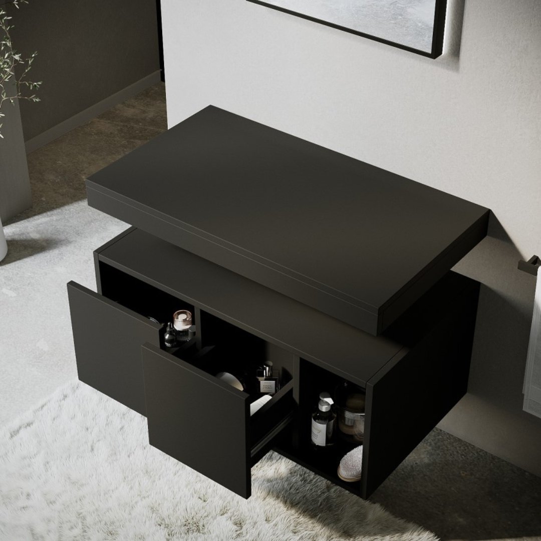 Achieve a clean, architectural look in your bathroom with this floating bathroom vanity. Built for the sleekest spaces, it features a flat black finish, hidden storage compartments, and a separate minimalist floating countertop perfect for vessel basins. Designed with a sophisticated UAE lifestyle in mind, this vanity set transforms any ordinary bathroom into a space of balance, order, and beauty.