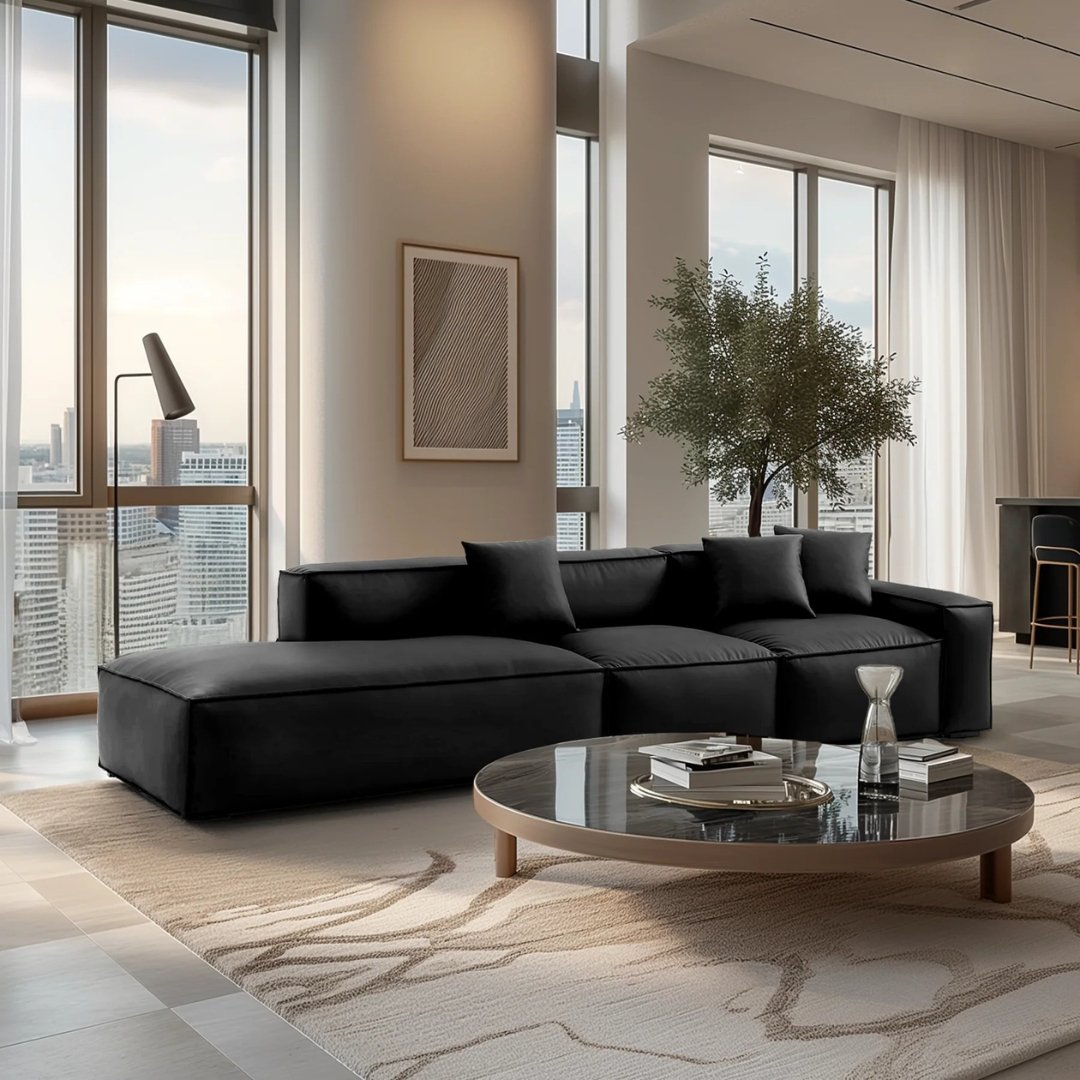 A modern L-shaped sectional sofa with a chaise, placed in a high-rise apartment with floor-to-ceiling windows, a sleek circular coffee table, and a minimalist urban aesthetic. The sofa’s quality fabric and low-profile design exude modern elegance and luxury  ideal for upscale Dubai interiors. Shop the look now, UAE delivery available!
