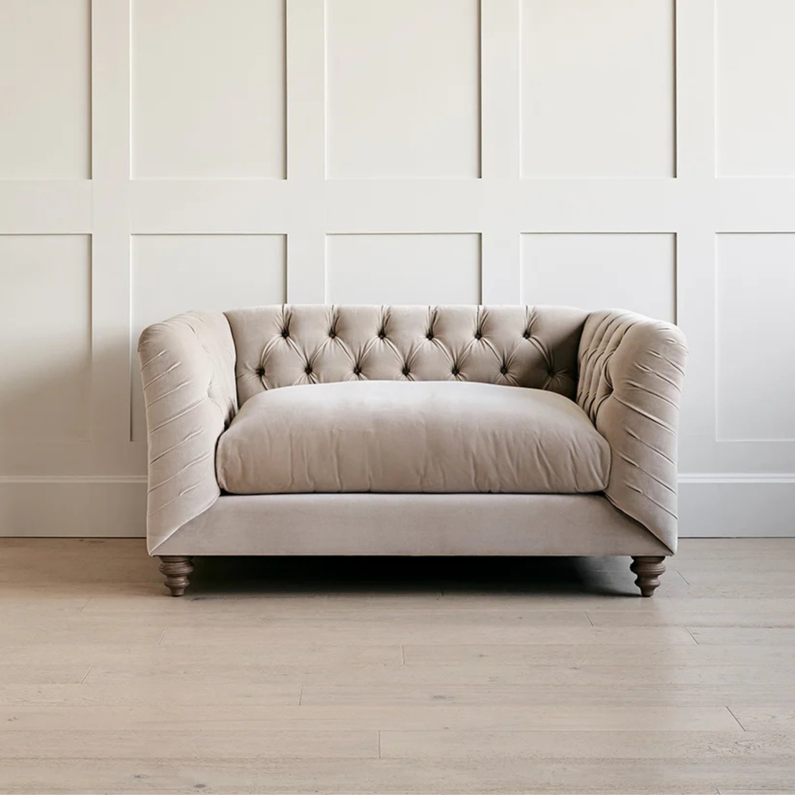 Timeless Chesterfield-Inspired Design: Deep button tufting and curved arms give a classic-meets-modern look.
